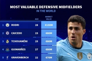 防守型中场身价:罗德里1.3亿欧最高,凯塞多、琼阿梅尼8000万欧